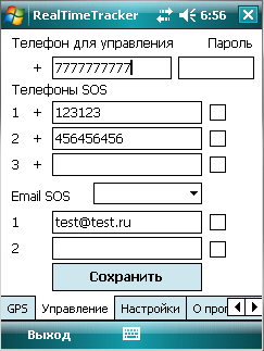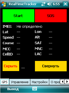 Принцип работы: Программа предназначена для мониторинга подвижных объектов в реальном режиме времени. Принцип действия основан на работе аппаратных GPS-трекеров: получение координат и отправка их на сервер с заданным интервалом. Так же реализовано управление посредством СМС-команд и скрытый режим работы. Посмотреть, как будет работать программа, можно прямо сейчас на нашем демо-сервере Интерфейс программы содержит несколько вкладок: GPS, Управление, Настройки, О программе. ![]() GPS - основная вкладка на которой расположены кнопки "Старт\Стоп", "SOS", "Скрыть", "Свернуть", а также некторые текущие данные - скорость, высота, азимут, координаты, данные вышек сотовой связи. Для начала работы программы в режиме отправки координат, нажмите кнопку "Старт", при этом надпись на кнопке изменится на "Стоп". Цвет кнопки обозначает состояние работы: красный - не запущено, зеленый - все хорошо, координаты записываются и отправляются. Кнопка SOS - По нажатию этой кнопки отправляется СМС или Email на заранее указанные адреса. Кнопка "Свернуть" - Скрывает программу с экрана, не прерывая работу программы. Для того, чтобы развернуть, нужно повторно запустить программу обычным способом, например кликнув по иконке запуска. Кнопка "Скрыть" - Полностью скрывает программу во время ее работы. Если выбран режимы автозапуска и скрытия программы, то программу вы больше не увидите. Выйти из этого режима можно только исправлением реестра. ![]()