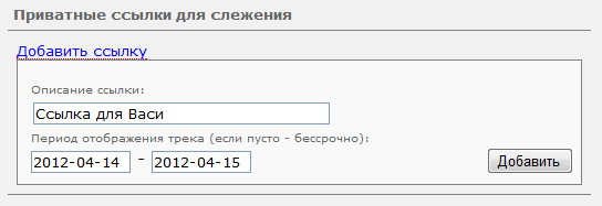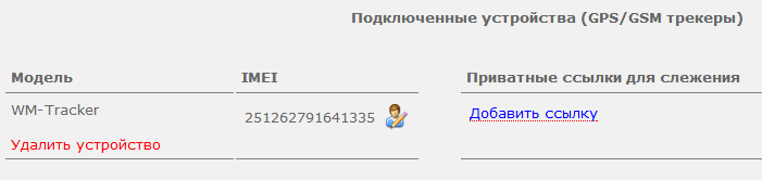 #tt start - начать получение координат и отправку на сервер #tt stop - остановить получение координат и отправку на сервер #tt get - получить текущую координату из GPS с помощью СМС. Если программа в режиме "остановлено", то начнется получение координат и после отправки программа переключится в режим "остановлено". #tt gete - получить текущую координату из GPS на Email со ссылкой на карту. Если программа в режиме "остановлено", то начнется получение координат и после отправки программа переключится в режим "остановлено". #tt getgsm - получить текущую координату, определенную по текущей GSM-соте, с помощью СМС. Если программа в режиме "остановлено", то начнется получение координат и после отправки программа переключится в режим "остановлено". #tt getgsme - получить текущую координату, определенную по текущей GSM-соте, на Email со ссылкой на карту. Если программа в режиме "остановлено", то начнется получение координат и после отправки программа переключится в режим "остановлено". СМС приходит на номер, указанный в настройках - "телефон для управления" Любая из команд поддерживает пароль: #ttpassword start Пароль позволяет игнорировать указанный в настройках "телефон для управления" и ответная СМС придет на телефон отправителя Команды gete и getgsme позволяют указать третьим параметром email адрес для получения координаты: #tt gete email@mail.ru Если адрес не указан, то письмо придет на первый адрес из настроек программы, если первый адрес не указан - то на второй. Если второго нет, то команда проигнорируется Где можно посмотреть результаты. Здесь, на сайте в меню "Мониторинг" (в выезжающей панели "Показать на карте"), вы увидите все свои подключенные аппаратные трекеры. Как подключить трекер. В личном кабинете, в меню "Мои трекеры" зарегистрируйте новый трекер. Для этого выберите модель трекера (для данной программы это "WM-Tracker") и введите IMEI который указан в первой вкладке программы. Смотрите пример: ![]() ![]() После того, как трекер подключен, он отобразится у вас в меню "Мониторинг" и будет доступен только вам. Если этого достаточно, то больше ничего делать не нужно. Однако, часто требуется просмотр трекера не только вами, но и другими людьми, которые могут быть не зарегистрированы на livegpstracks.com. Наиболее просто это делается с помощью приватных ссылок, которые легко отправить нужному человеку любым удобным вам способом. Для каждого трекера можно сгенерировать любое количество уникальных ссылок, задать описание и время действия каждой из них. Пример создания такой ссылки в картинках: ![]() ![]() В данном примере мы создали ссылку для Васи, подписали, чтобы не забыть для каких целей мы создали эту ссылку и задали период отображения ссылки. Отдельно стоит рассказать о "Периоде отображения". Это тот период, за который можно просматривать данные по этой ссылке. В данном примере это интервал с 4-го по 15-е мая. Человек, получивший эту ссылку может просматривать данные до тех пор, пока вы не удалите эту ссылку, но данные будут показываться только за указанный период времени. Созданные ссылки можно редактировать и удалять. Если вам чего-либо не хватает в программе, если вы заметили ошибки - пишите. Наш E-Mail support@livegpstracks.com |