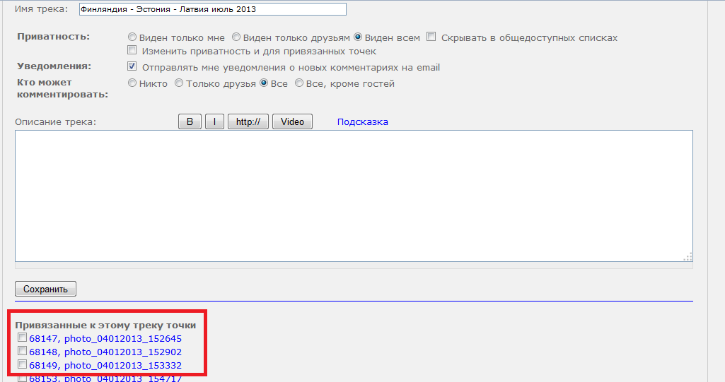 Либо из раздела Мониторинг (если записывали трек нашими программами) сохранить в "Мои треки", либо в самом разделе "Мои треки" загрузить на сайт через форму загрузки трек, записанный сторонней программой.