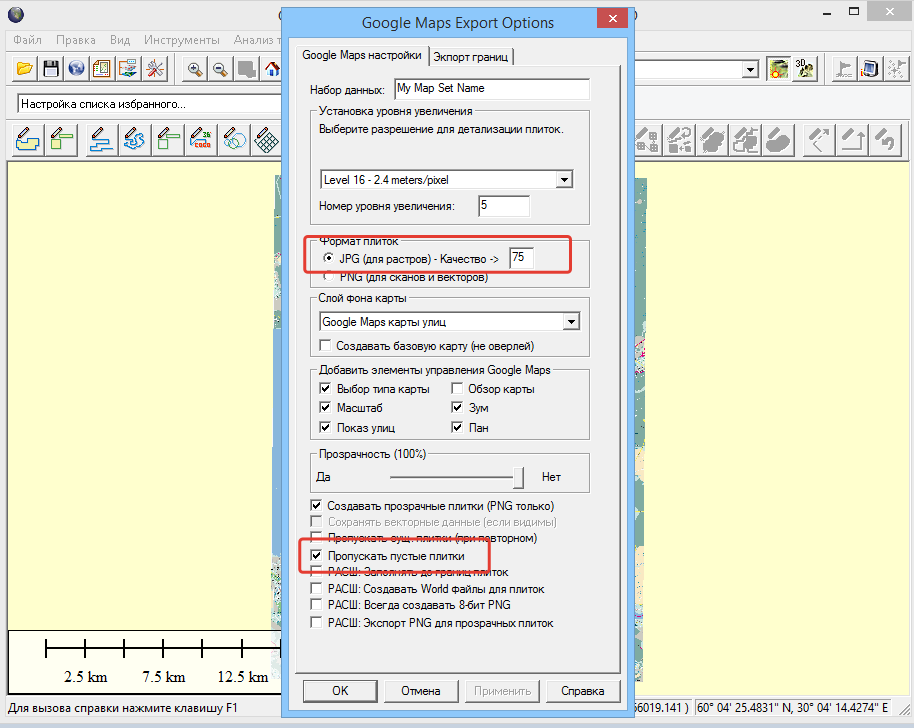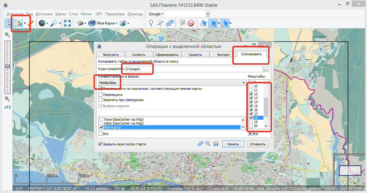 Путь куда сохранять, нужные масштабы, и (главное!) тип, в который конвертировать - MobileAtlas
