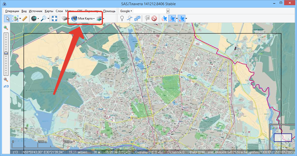 Открываем SAS Planet и в меню "карты" выбираем пункт "Моя Карта".