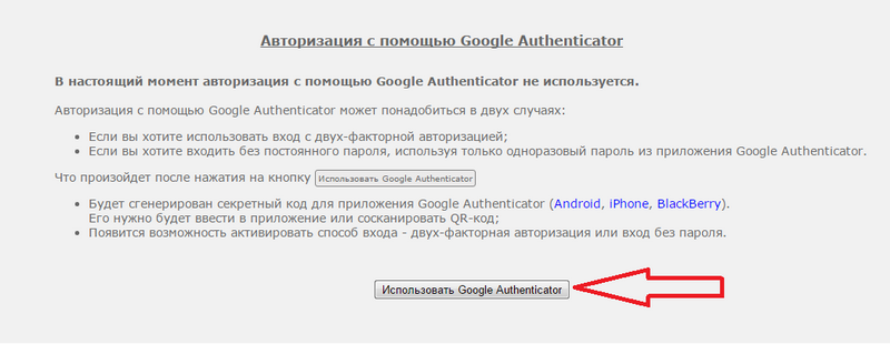 Для перехода к настройке режима нажмите кнопку "Использовать Google Authenticator"