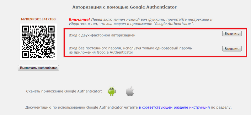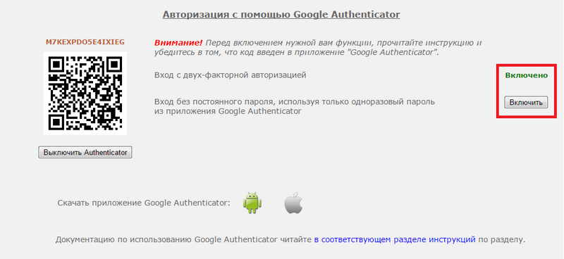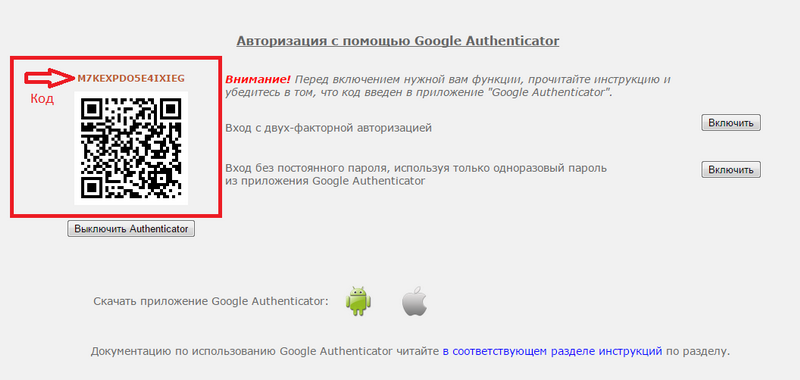 Слева появится код для приложения Google Authenticator. Откройте приложение на своем смартфоне и введите код вручную, либо сосканируйте QR-код.