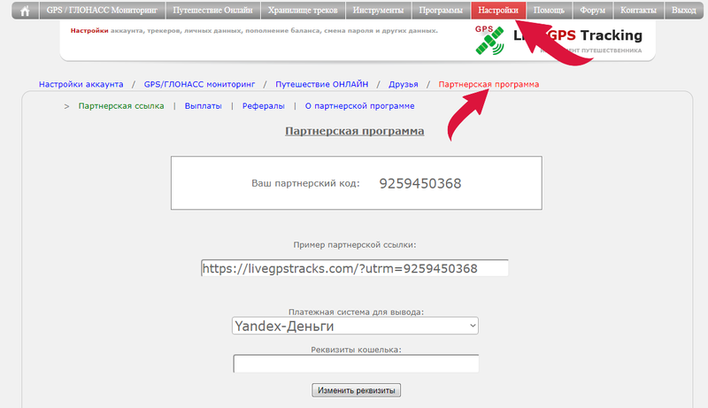 "Пример партнерской ссылки" - так должна выглядеть ссылка, которую вы размещаете для привлечения рефералов. Разумеется, ссылку можно размещать на любую страницу сайта. Важно только указывать параметр "utrm" и ваш код: utrm=9259450368