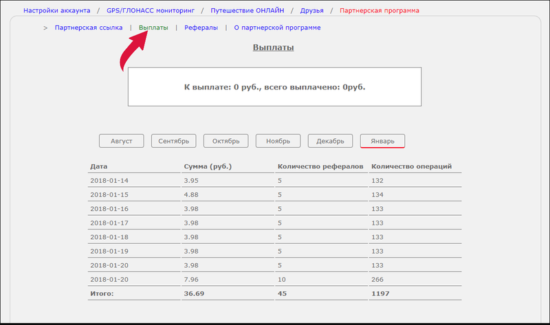 • Всего выплачено - указывается значение фактически выплаченных средств за всю историю использования партнерской программой. Ежемесячно значение увеличивается на сумму фактически выплаченных средств.
