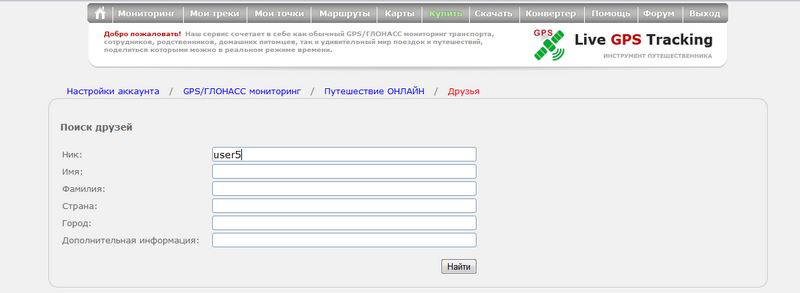 В форме заполните поля, которые помогут найти друга.