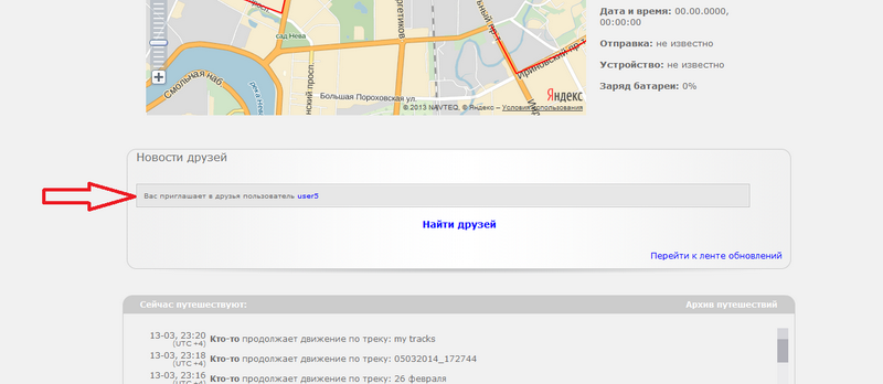 Если другой пользователь прислал вам приглашение в друзья, то после авторизации на сайте вы увидите его в блоке "Новости друзей" в разделе "Путешествие Онлайн".
