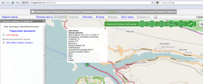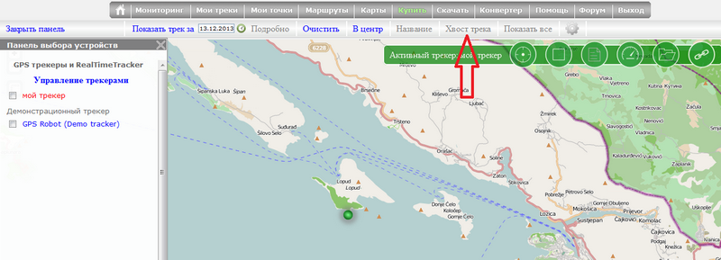 Так же в зеленой панели на карте отображается какой трекер в данный момент выведен.
