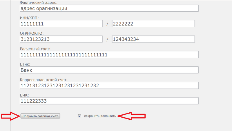 После заполнения всех полей активируйте настройку "сохранить реквизиты", для подстановки введенных данных автоматически при следующей выписке счета.