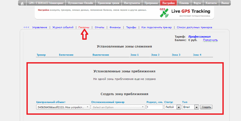 В горизонтальном меню управления выберите пункт "Геозоны"