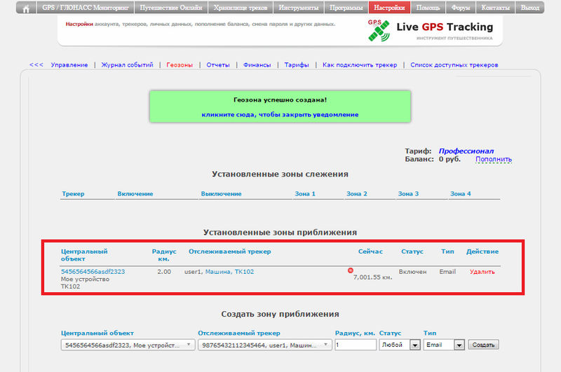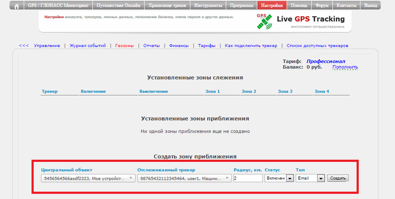 Зоны приближения не отображаются на карте. Все действия совершаются только через соответствующее меню Управления трекерми.