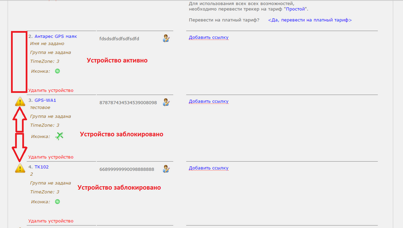 2. В Управлении трекерами рядом с устройством есть желтый восклицательный знак