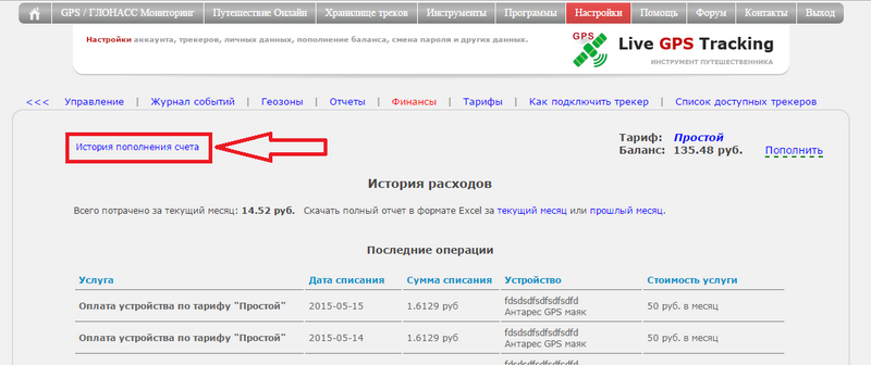 Так же на странице финансов можно посмотреть историю пополнения счета.