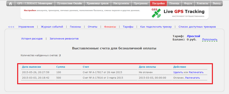 Выписанные счета можно распечатать или удалить. Для этого выберите нужную ссылку в колонке
