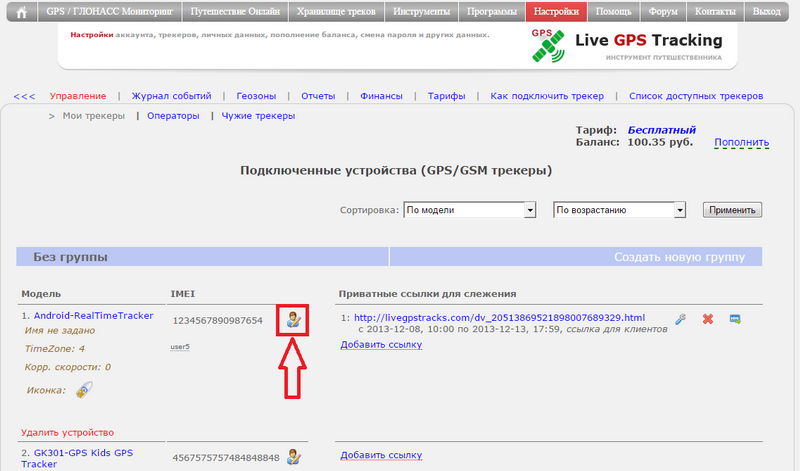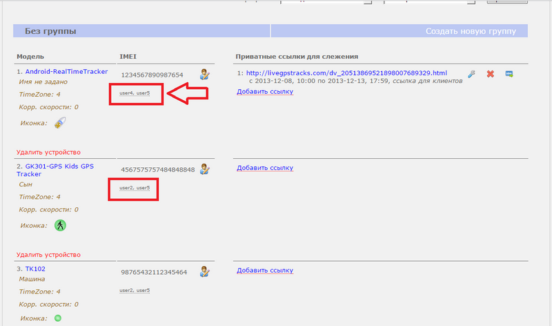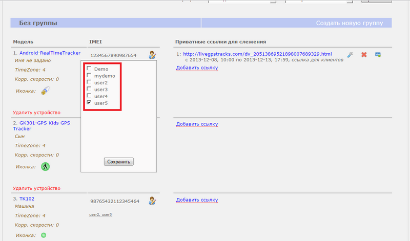 Все друзья, у которых есть доступ к трекеру появятся в виде списка под IMEI трекера.