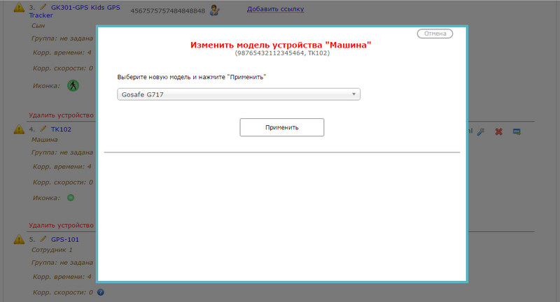 • Модель возможно изменить только у активных трекеров и тестового устройства. Если трекеры отключены после исчерпания средств, модель изменить нельзя.