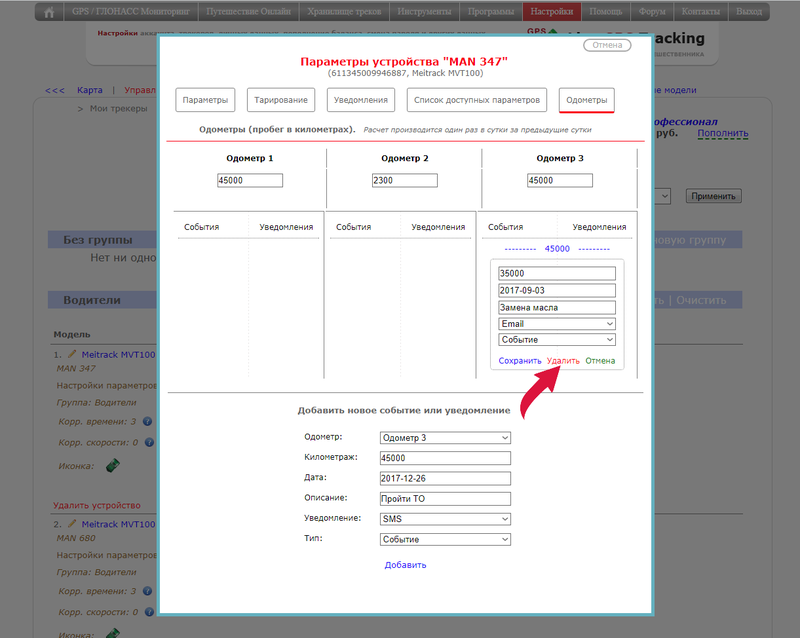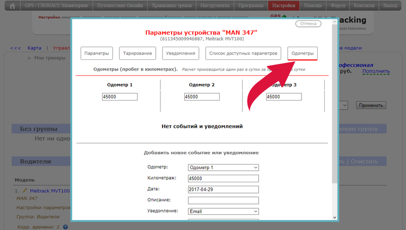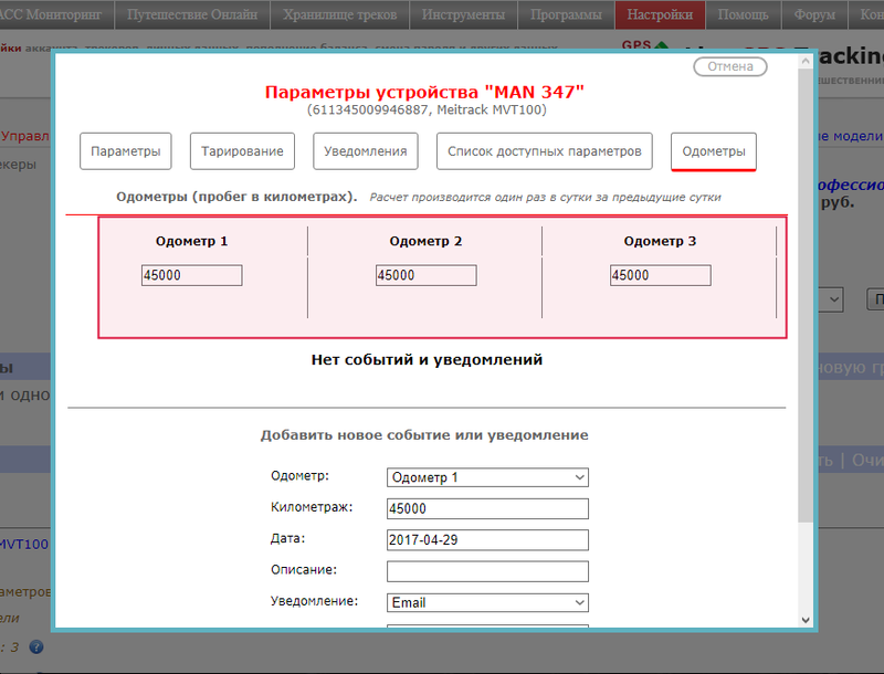 Одометры настраиваются по каждому подключенному в аккаунт трекеру.