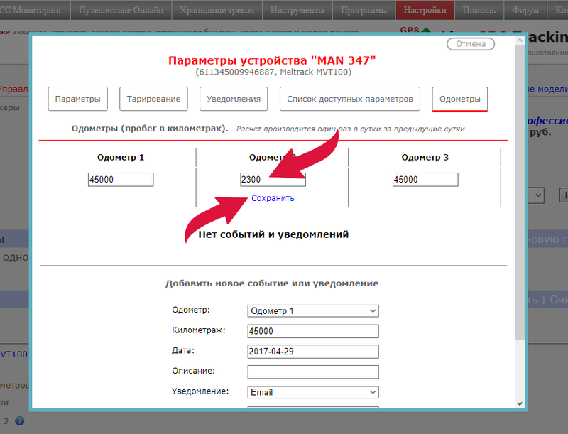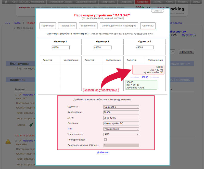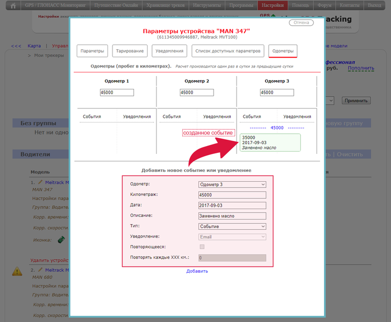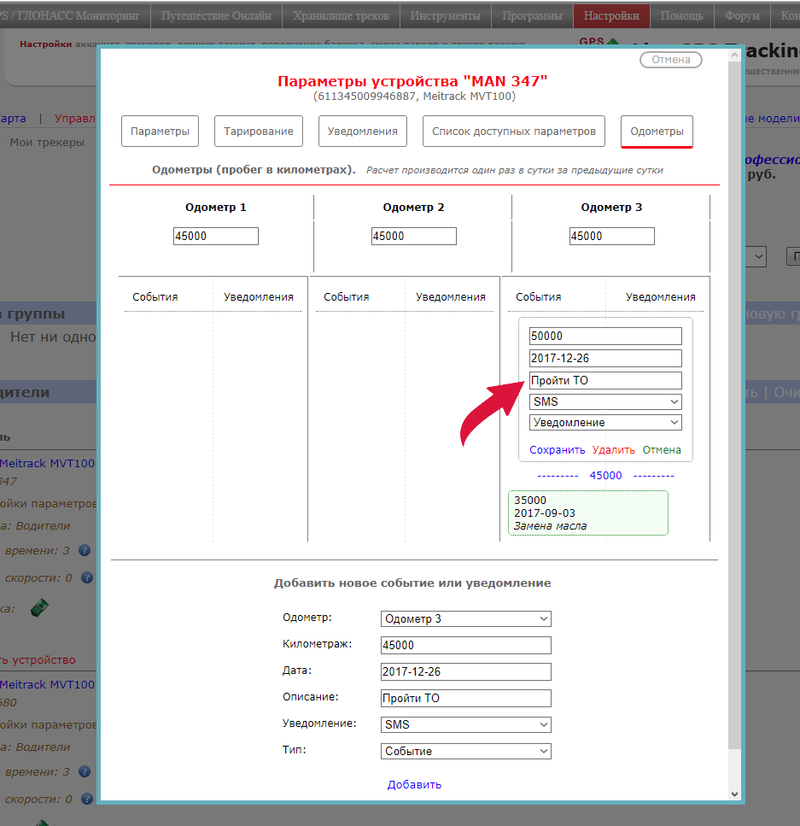 Уже установленные значения одометров возможно редактировать, а так же устанавливать оповещения о достижении определенного значения или о том, что на определенном значение километража было совершено какой-то действие, например, замена масла, тех. обслуживание и т.д.