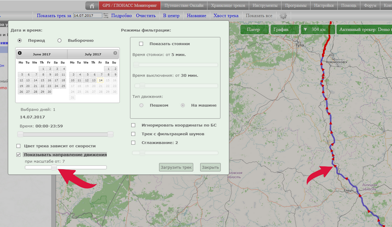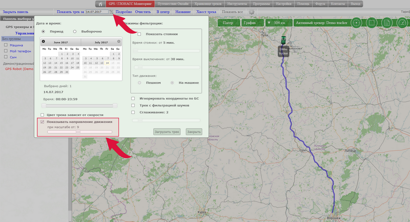 Как включить вывод направления движения?Зайдите в раздел "GPS/ГЛОНАСС Мониторинг" (верхнее меню сайта)