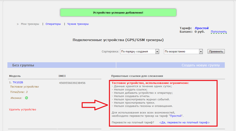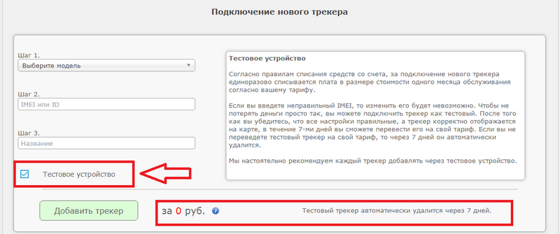 Для избежания ошибок при подключении (ошибка при вводе IMEI, трекер присылает укороченный IMEI и др.) можно подключить трекер как тестовый.