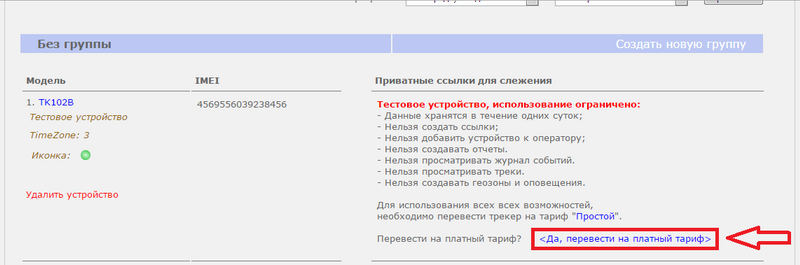 Для перевода устройства на тариф нажмите на "Да, перевести на платный тариф"