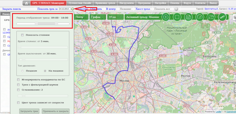 Вывод трека по времениТрек можно построить не только за целые сутки, но и за любой временной интервал в пределах суток.