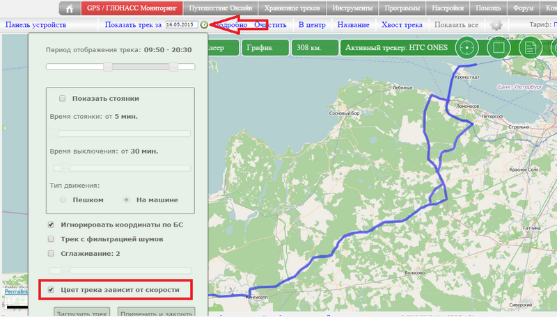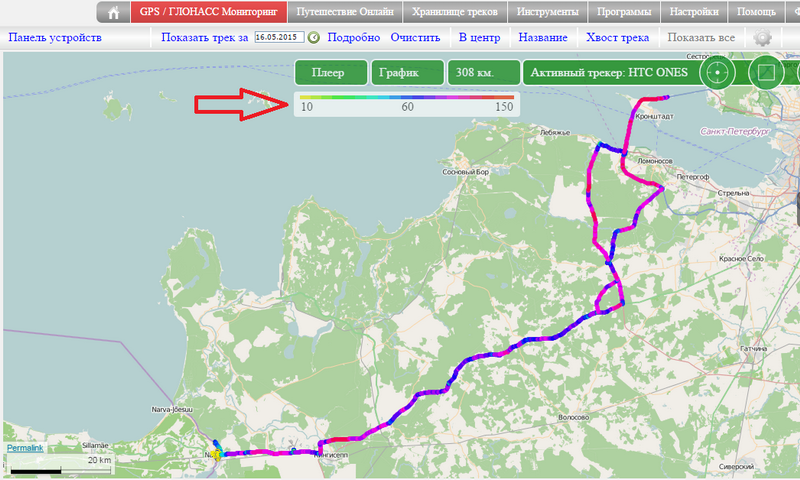 В зависимости от скорости трек будет выведен с различной цветовой индикацией. Так же на карте появится информационная шкала, показывающая какой цвет соответствует определенной скорости.