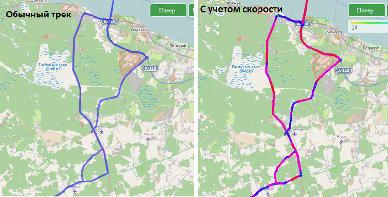 Как выглядит один и тот же трек с учетом скорости и без: