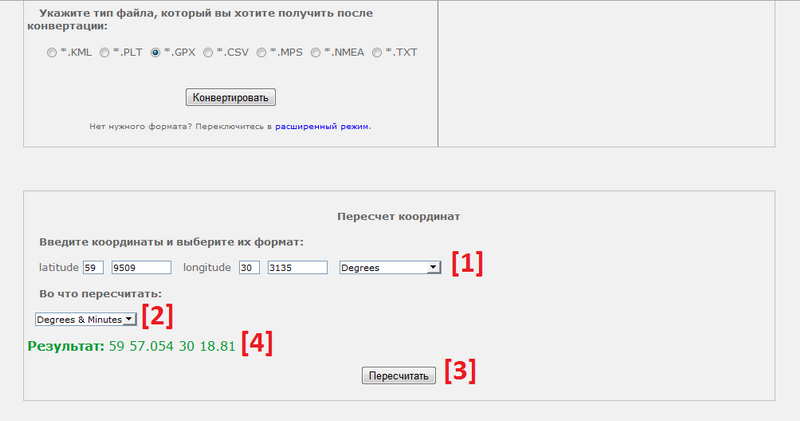 Конвертер позволяет пересчитывать координаты из градусов в градусы-минуты и наоборот.