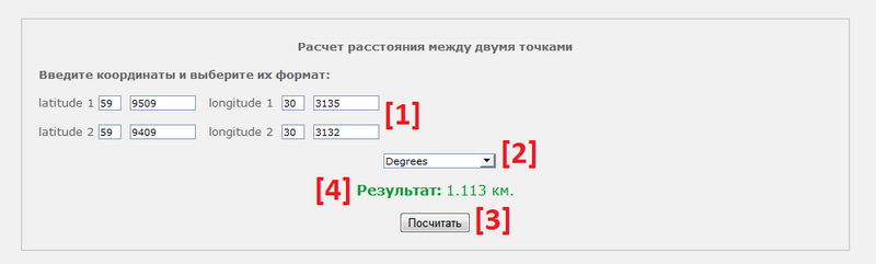 [1] Введите координаты точек, между которыми требуется рассчитать расстояние