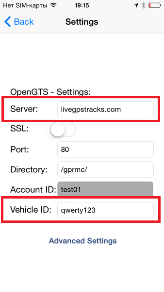Для настройки необходимо в меню "Settings" указать два параметра - "Server" и "Vehicle ID":