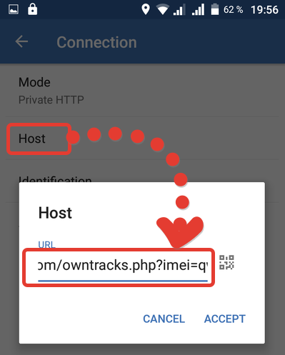 Preferences - Connection - Host - http://livegpstracks.com/owntracks.php?imei=qwerty123