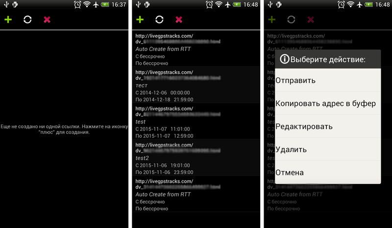 Перед появлением списка доступных приложений, происходит проверка корректности ссылки. Для этого осуществляется синхронизация с сайтом http://livegpstracks.com. Если возникли проблемы с корректностью ссылки, приложение выдаст предупреждение. Если проверка прошла успешно, на экране появится список приложений, через которые возможно поделиться ссылкой.