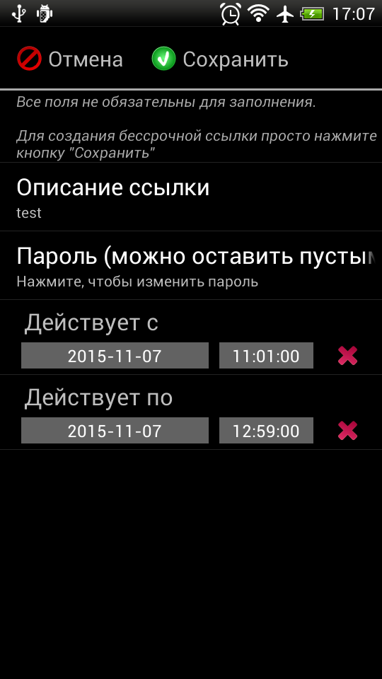 Для того, чтобы создать бессрочную ссылку без названия и пароля достаточно просто нажать кнопку "Сохранить".