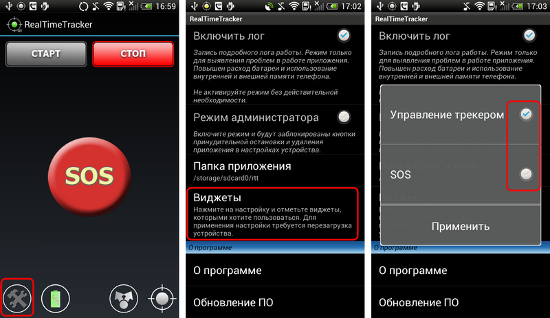 Приложение предоставляет возможность вынести на рабочий стол смартфона два виджета - для управлением запуском/остановкой трекера и кнопка SOS.