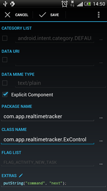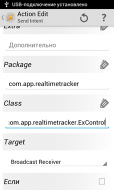 В настройках сторонних приложений требуется указывать пакет нашего приложения (Package) и компонент, отвечающий за выполнение команд (Class).