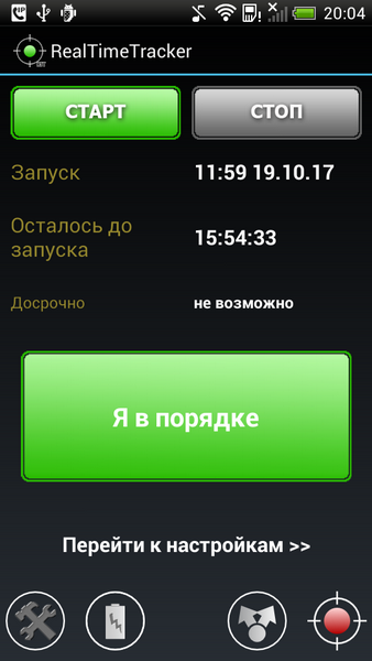 Трекер постоянно выключен, но в установленное время срабатывает будильник, который включает экран приложения, где обязательно нужно вручную нажать кнопку отмены. Если кнопка не нажата через установленное время это может означать, что владелец смартфона попал в сложную ситуацию и нуждается в помощи. В этом случае автоматически сработает режим SOS с отправкой СМС уведомления на установленные номера, а так же оповещением на сайт сервиса мониторинга.