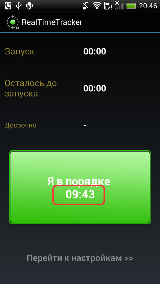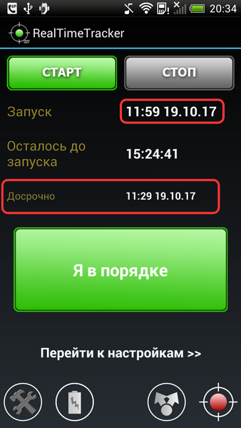 • Кнопка "Я в порядке" - кнопка отмены режима. При срабатывании будильник нужно нажать именно на нее