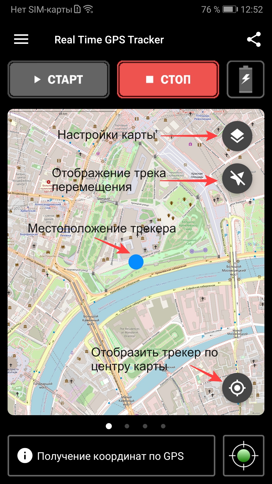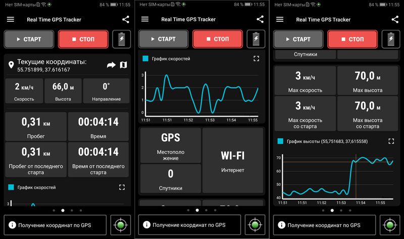 Когда трекер выключен (нажата кнопка "Стоп"), показатели, отображающие значения в реальном времени (скорость движения, высота, наличие спутников GPS и пр.) будут нулевые или в виде прочерка.