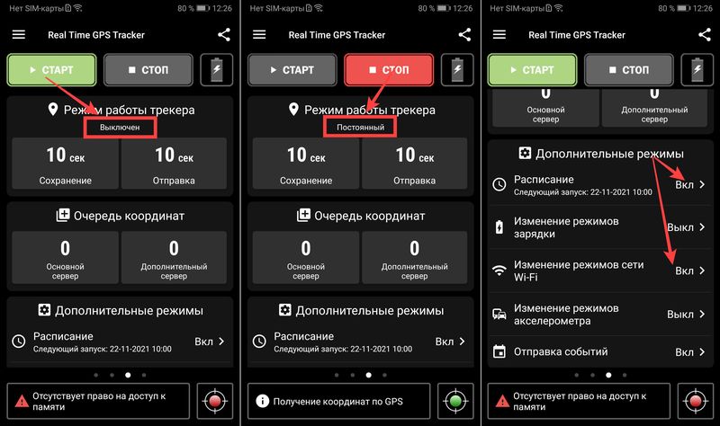 • Режим, в котором работает трекер (Постоянный или Экономичный), либо информацию, что на данный момент трекер выключен