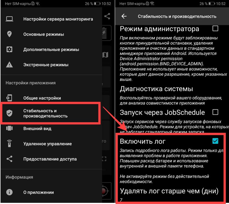 << Перейти к оглавлениюТехнический лог работы приложения.Откройте "Боковое меню" - пункт "Стабильность и производительность" - активируйте настройку "Включить лог"